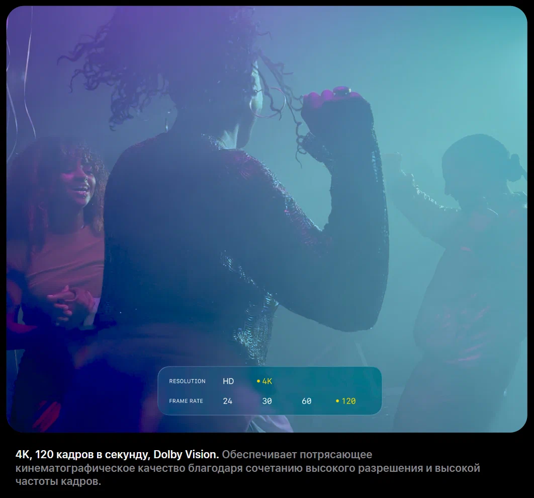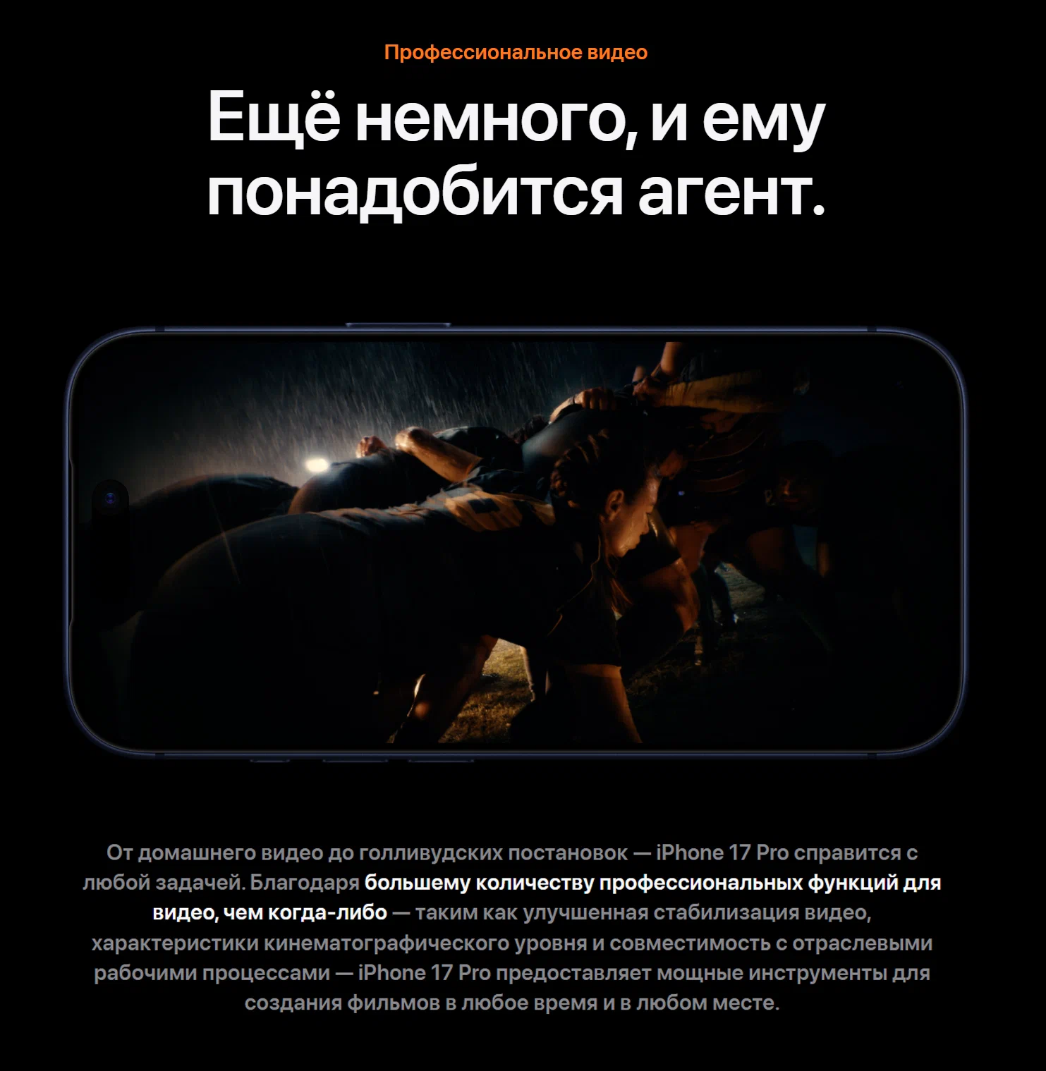 Киноуровень съёмки на iPhone 17 Pro От домашних роликов до профессиональных постановок — iPhone 17 Pro справится с любыми задачами. Устройство предлагает больше профессиональных видеовозможностей, включая улучшенную стабилизацию, кинематографические функции и совместимость с отраслевыми стандартами, что превращает смартфон в мощный инструмент для съёмок в любом месте.ProRes RAW iPhone 17 Pro — первый смартфон с поддержкой этого передового видеокодека Apple, который даёт максимальный контроль над изображением и высочайшее качество записи.Профессиональные рабочие процессы Поддерживаются расширенный цветовой охват с Apple Log 2, вещательные частоты кадров и открытый шлюз записи, что упрощает интеграцию в профессиональные постпродакшн-процессы.Генлок и временной код Поддержка синхронизации по генлоку и TC обеспечивает точную временную координацию кадров — ключевое для создателей контента и кинопроизводства, реализуется с помощью нового Blackmagic Camera ProDock.