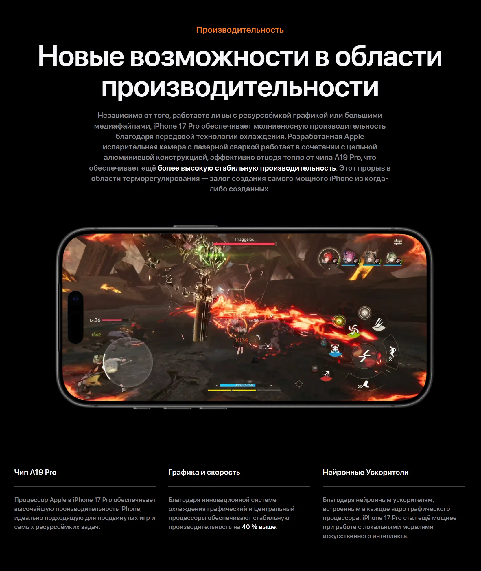 Высокая производительность при нагрузках Работаете с тяжёлой графикой или крупными медиафайлами — iPhone 17 Pro обеспечивает выдающуюся производительность благодаря усовершенствованной системе охлаждения.Испарительная камера с лазерной сваркой Фирменная испарительная камера Apple, выполненная с использованием лазерной сварки, эффективно отводит тепло от компонентов, повышая стабильность работы под длительной нагрузкой.Цельный алюминиевый корпус Моноблочный алюминиевый корпус служит дополнительным тепловым интерфейсом, ускоряя рассеивание тепла от чипа A19 Pro.Результат Сочетание этих технологий обеспечивает более устойчивую и высокую производительность, делая iPhone 17 Pro одним из самых мощных iPhone на сегодняшний день.